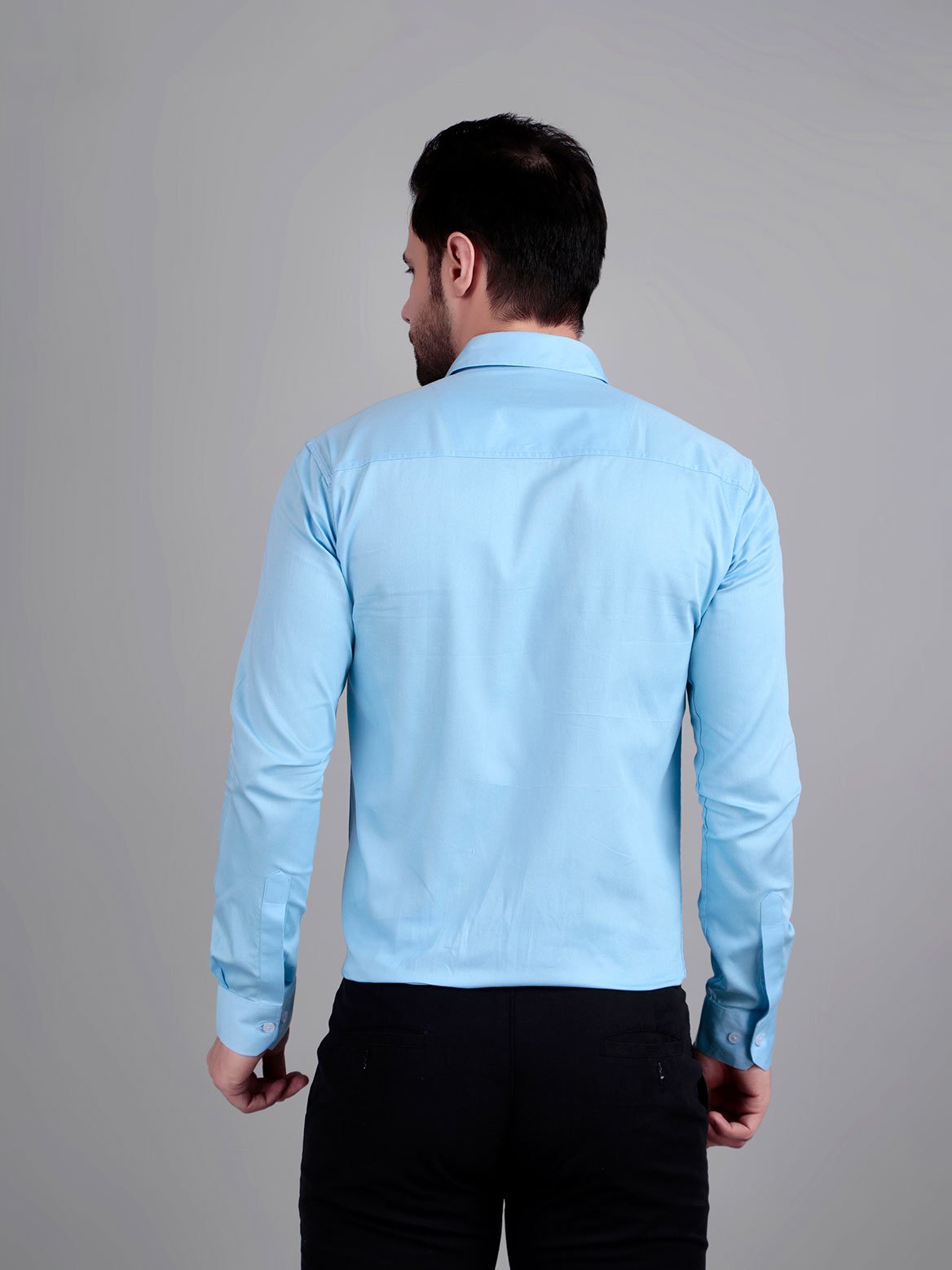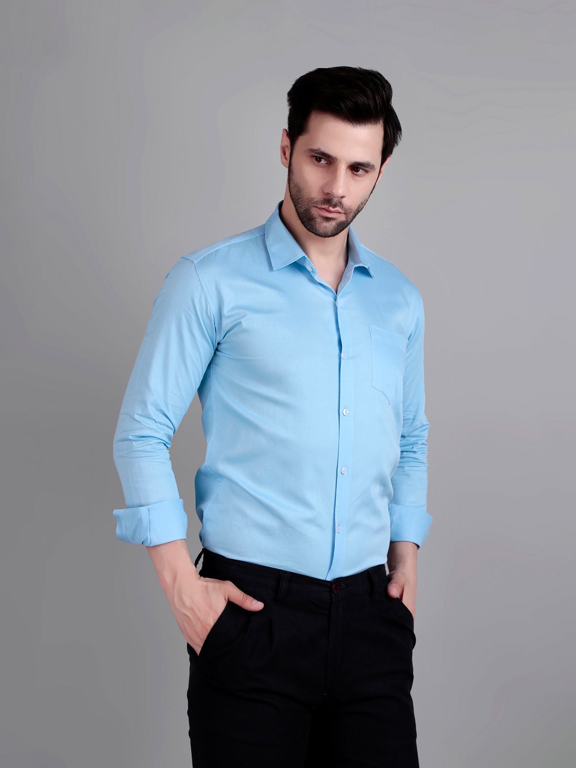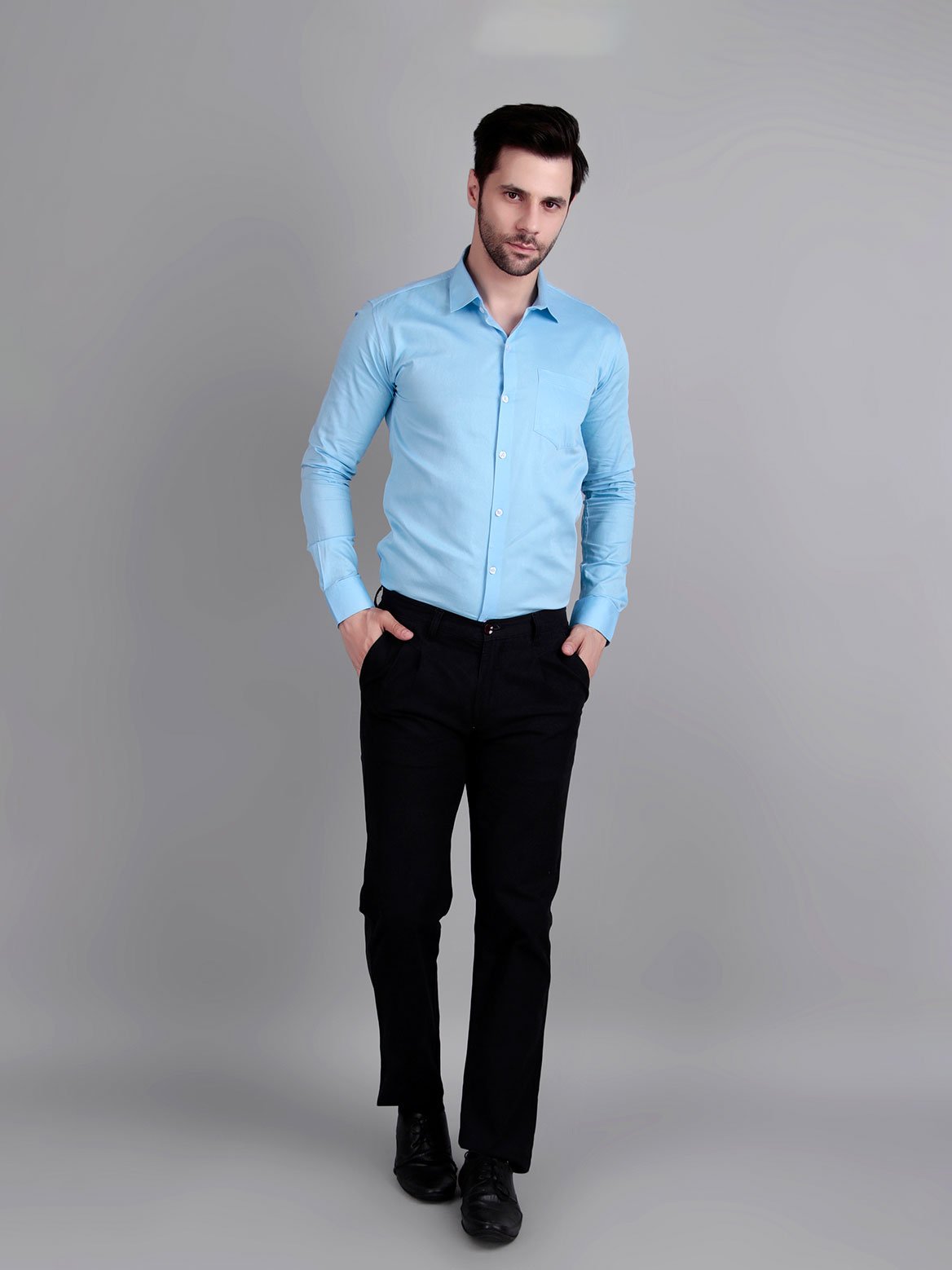 Crisp look and premium feel. The sky blue shade pairs beautifully with dark trousers.