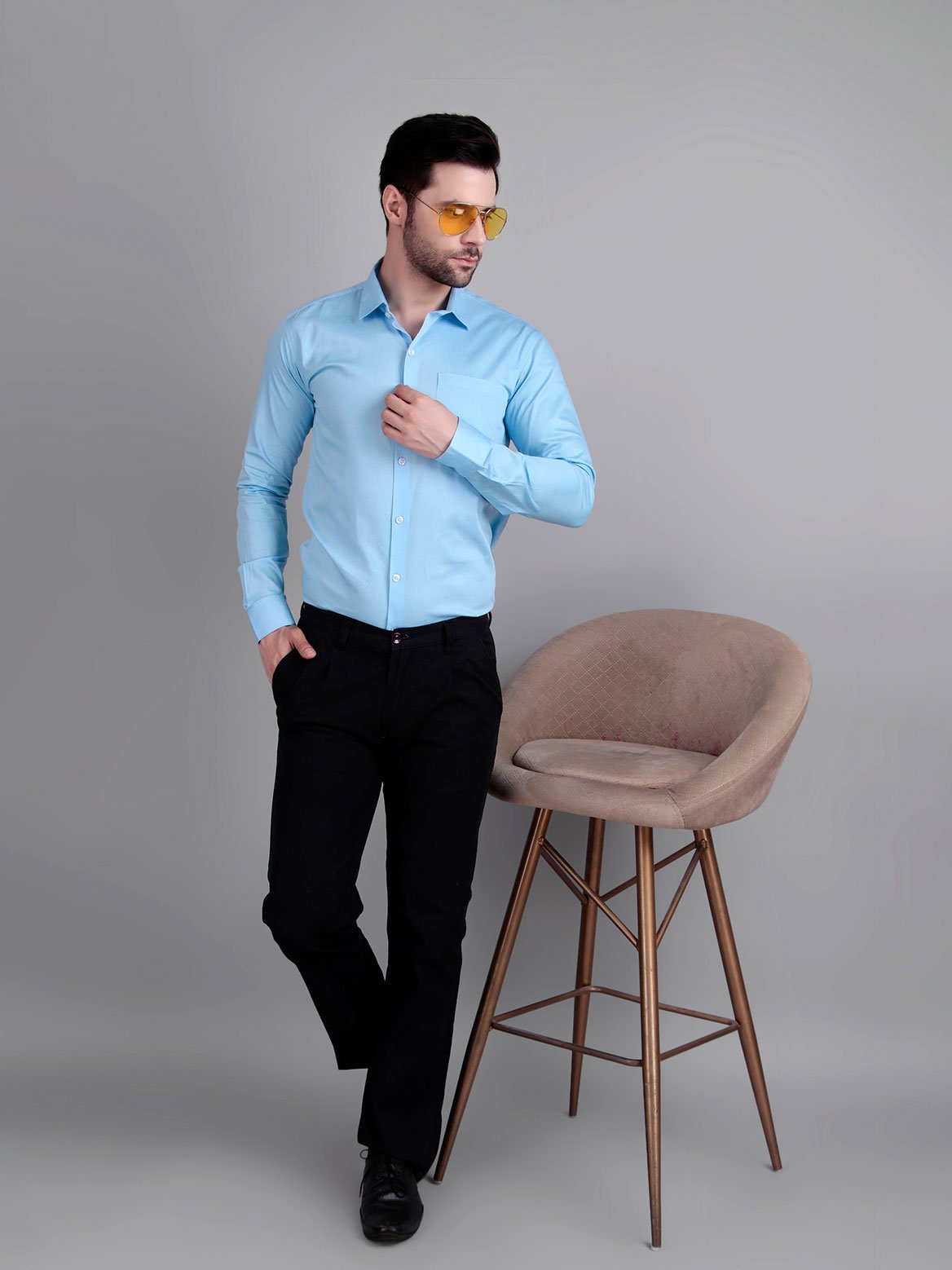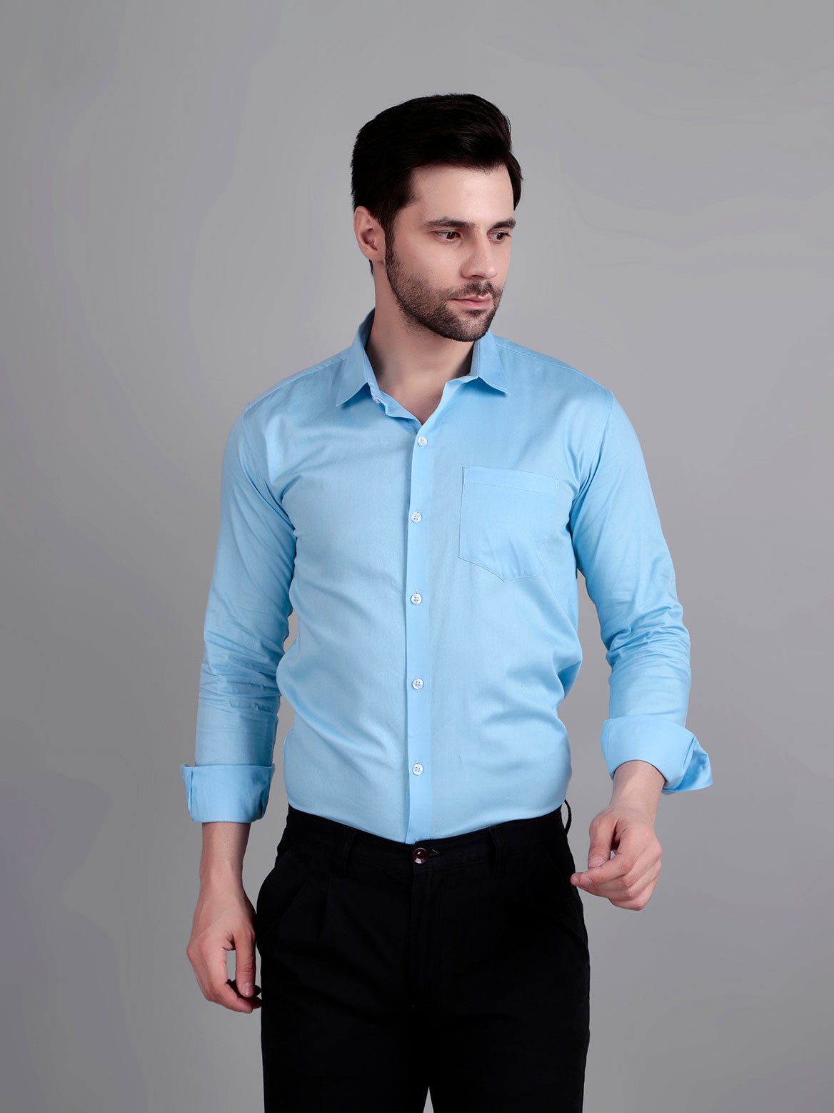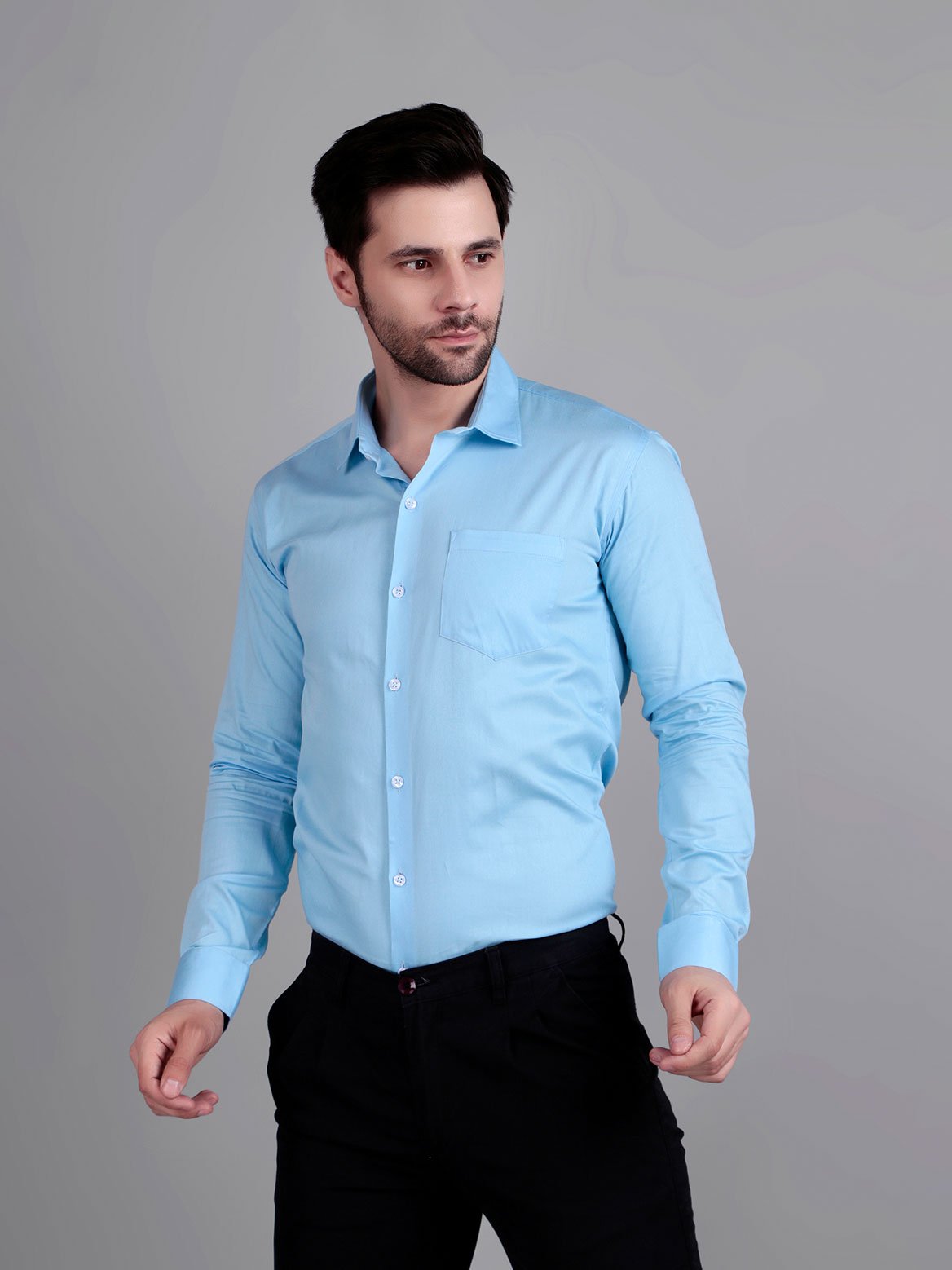 Crisp look and premium feel. The sky blue shade pairs beautifully with dark trousers.